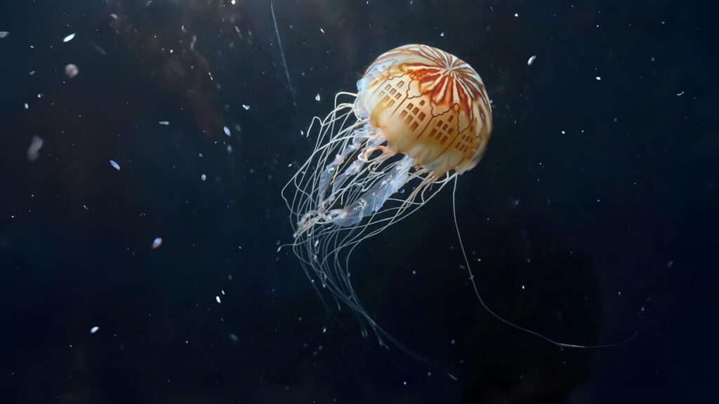 De kwal kent geen nationaliteit, geen erfgoedbeleid. Maar hij draagt een specifiek beeld met zich mee. Een archief van huid in plaats van steen. Geen museum, maar een drijvend monument.